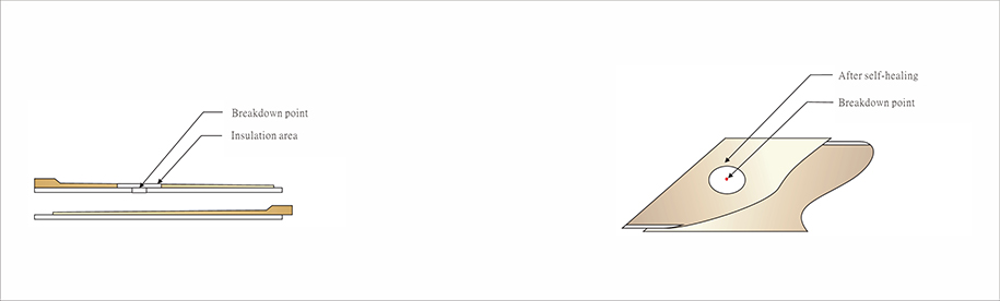 Capacitor metallized film electrode using zinc-aluminum composite technology, the thickness of the electrode is very thin, when the capacitor inside the electrical overload or temperature is too high, there is electrical breakdown phenomenon, the breakdown of the electrode around the ionization, breakdown point to the electrode medium Layer gasification separated, resulting in insulation, the capacitor back to normal working ability.