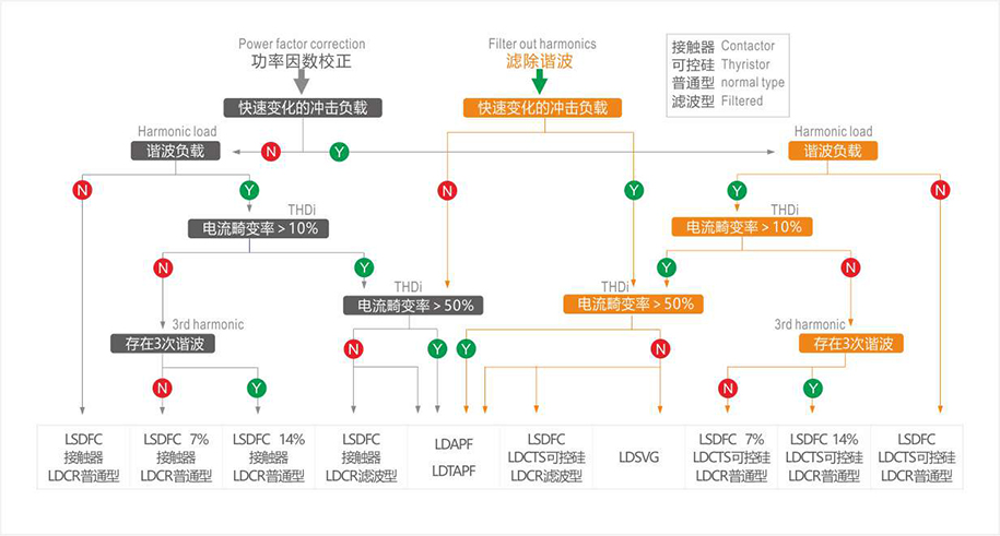 一般情况下电气设计图纸标有补偿柜的总容量,如果电气设计图未标出补偿容量,成套厂可根据变压器容量的20%~40%选择无功补偿柜容量。无功补偿柜补偿类型的选择是最重要的环节,选型正确与否直接影响补偿柜的效率和可靠性。补偿类型的关键选型依据是系统的谐波污染程度,由于配电系统中非线性负载越来越多的被使用,其带来的谐波污染问题日益严重,而无功补偿电容器是配电设备中受谐波危害最大的设备之一,谐波不仅会造成电容器过载,乏值降低,缩短使用寿命,还可能造成电网谐振,发生严重的电气事故,另外,不正确的补偿类型选择还会造成谐波放大,进一步加剧配电网谐波污染程度。因此,必须根据谐波污染程度选择正确的无功补偿类型。并且依据不同的运行环境选择不同的混合补偿模式:SVG+TSC、APF+TSC等。以下针对组合模式进行图识说明: