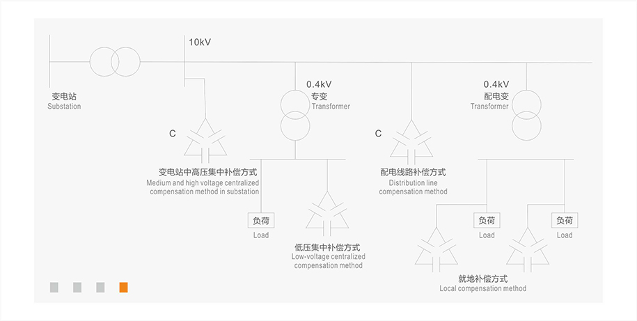¤ 低压就地无功补偿:该补偿是根据具体用电设备无功的产生量将电容器组与用电设备并连,通常和用电设备合用一套开关与其同时投入运行或断开。随机吸收电感性设备的无功能量,转换成有功能量反送回电感设备,其 补偿范围大,补偿效果也好,能就地平衡无功电流。