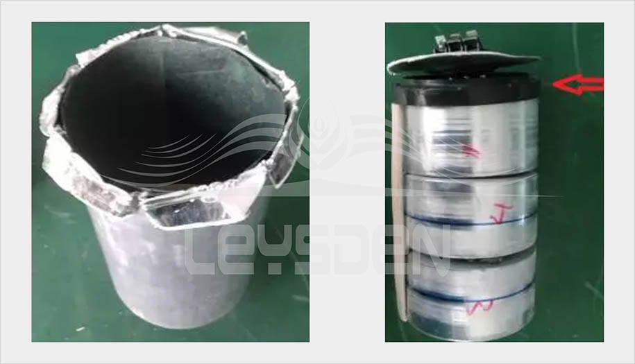 左边为电容圆柱形罐壳,右边为电容芯子。